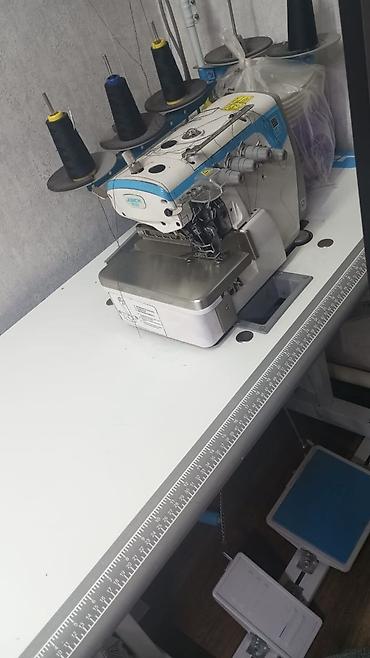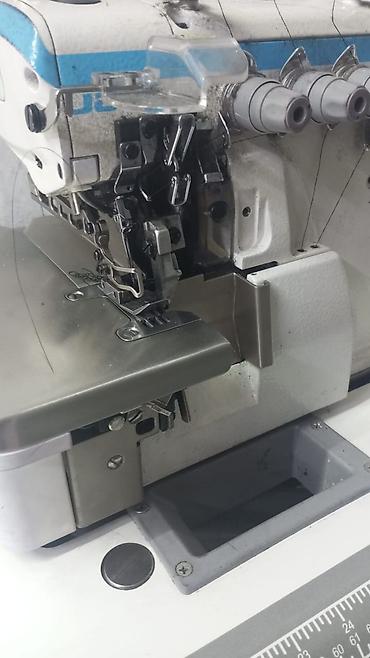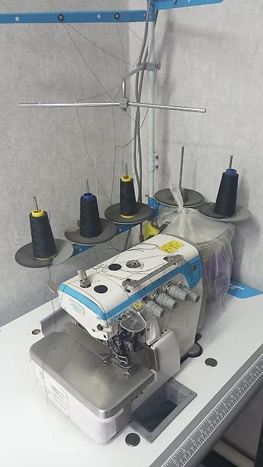 Промышленный оверлок JACK (серия JK/Е4, электроуправление) на столе со стойкой для нитей.
