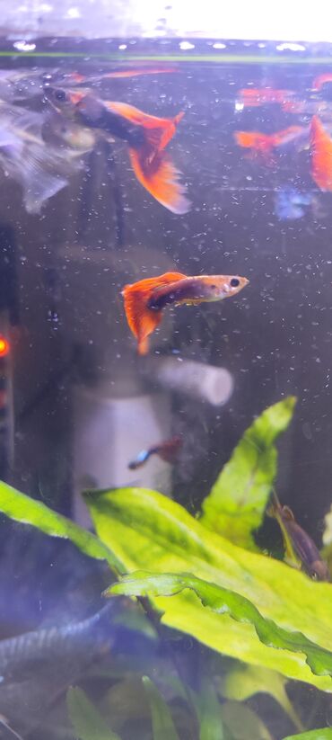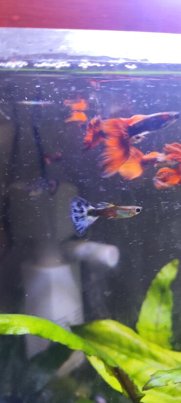 - Аквариумные рыбки с яркими, контрастными окрасками: встречаются самцы с огненными красно-оранжевыми хвостами, а также с сине-белыми и мраморными рисунками на хвостовом плавнике.