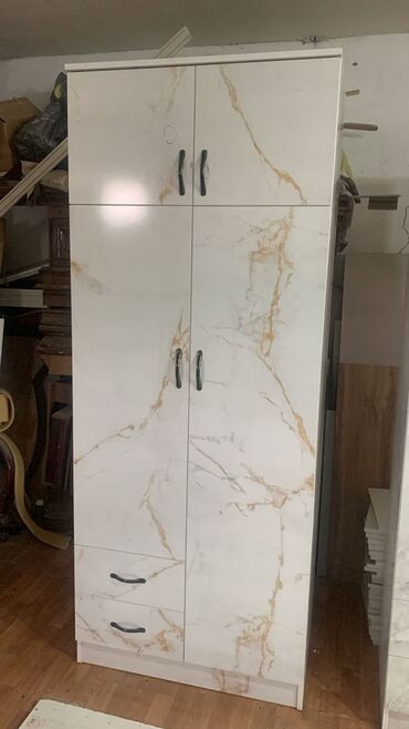 Шкаф-купе распашной для одежды - Модель с четырьмя распашными дверцами и двумя нижними выдвижными ящиками. - Дизайн: фасады под мрамор (серый и белый с золотистыми прожилками) и вариант под светло...