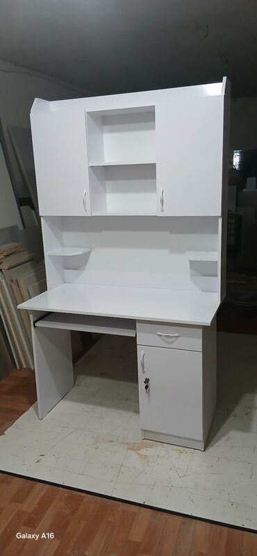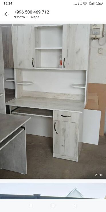 Письменный стол /надстройкой - Материал: ЛДСП светлого оттенка с кромкой ПВХ. - Конструкция: стол с широкой рабочей поверхностью и надстройкой. - Надстройка: два закрытых шкафа по бокам, между ним...