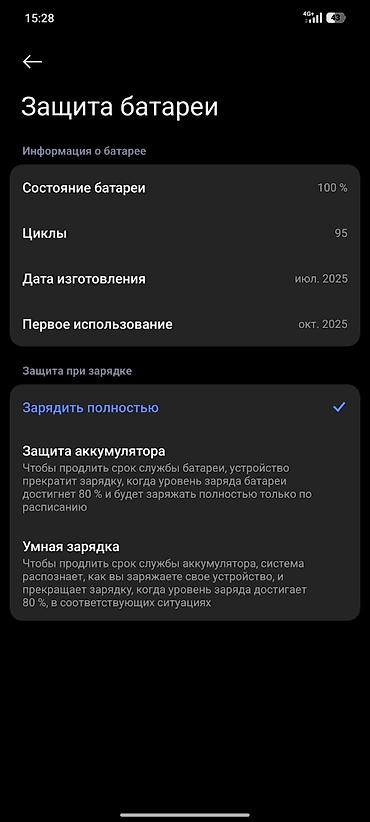 - Аккумулятор: состояние 100%, 95 циклов; функции «Защита аккумулятора» и «Умная зарядка».