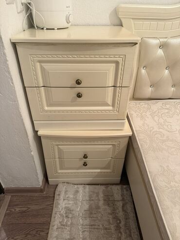 - Две прикроватные тумбы по 2 выдвижных ящика каждая, фасады с рамочными филенками и металлическими ручками под бронзу.