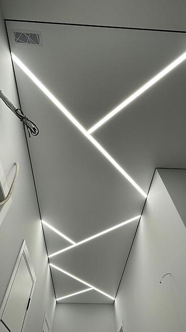 Натяжные потолки с дизайнерской подсветкой - Проектирование и монтаж натяжных потолков под ключ: одноуровневые, парящие линии по периметру, встроенные линейные светильники, теневой профиль без вид...