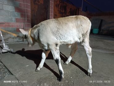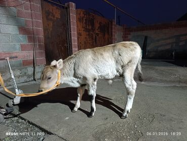 Теленок белого окраса. - Вид: крупный рогатый скот (теленок/бычок). - Окрас: светлый (почти белый), ровный, с пушистой зимней шерстью. - Возраст: молодняк. - Телосложение: крепкий корпус, ро...