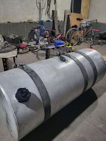 Алюминиевый топливный бак для грузовой техники. Характеристики: - Материал: алюминий, цилиндрическая форма с торцевыми донышками - Комплектация: три стальные монтажные хомуты с кронштейнами и перф...