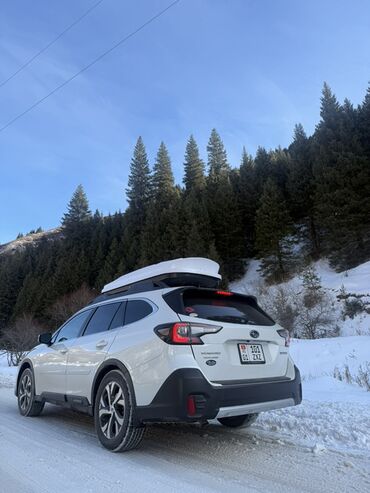 Subaru Outback, белый универсал с фирменным полным приводом Symmetrical AWD — надежный партнёр для города и поездок в горы. Просторный салон и большой багажник, высокий клиренс, светодиодная оптика, рейлинги на крыше и установленный аэродинамический багажный бокс