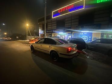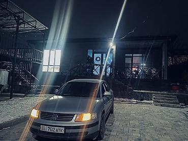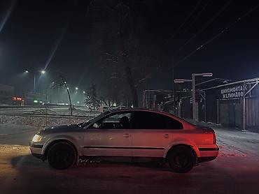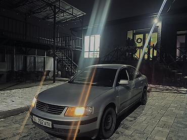 Volkswagen Passat B5 седан, серебристый цвет кузова. Пятидверный, просторный салон, тёмная тонировка задних стёкол. Черные стальные диски, зимние шины. Галогенные фары с жёлтым светом, передние противотуманки, задние фонари целые. Боковые зеркала в цвет кузова, молдинги по периметру. Передняя решётка с эмблемой VW, номер на киргизских госзнаках.
