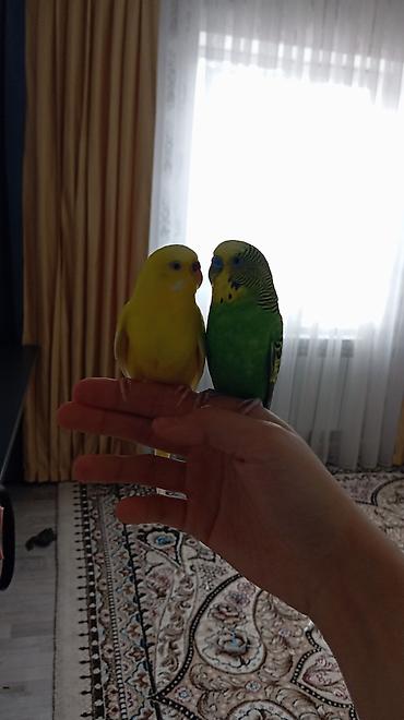 - Пара ручных волнистых попугаев: один ярко‑желтый, второй зелёный с чёрным волнистым рисунком. Привычны к руке.