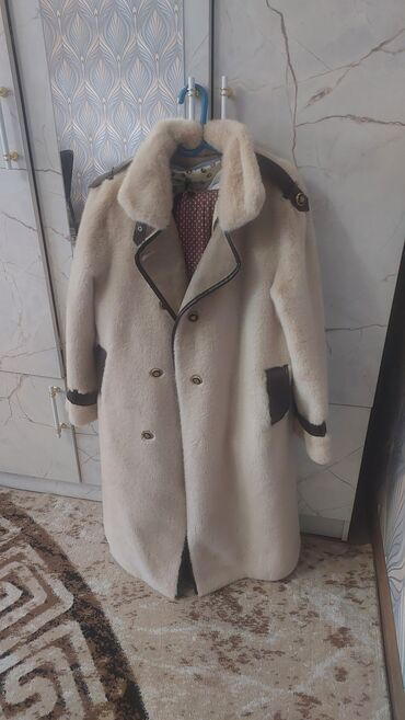 - Крой: двубортный, ниже колена, свободный силуэт.