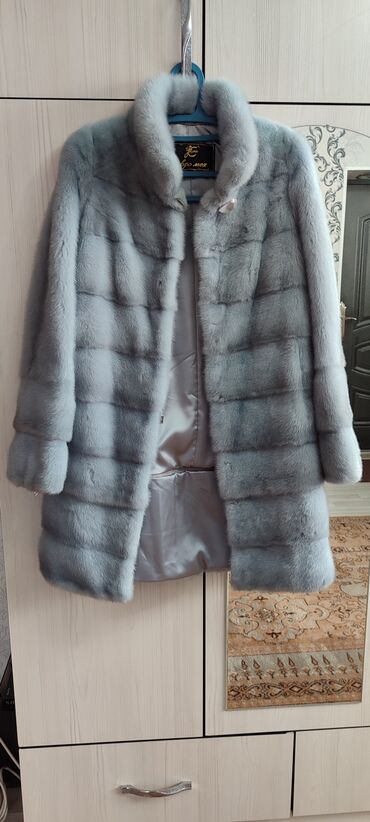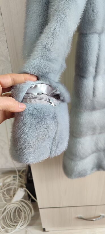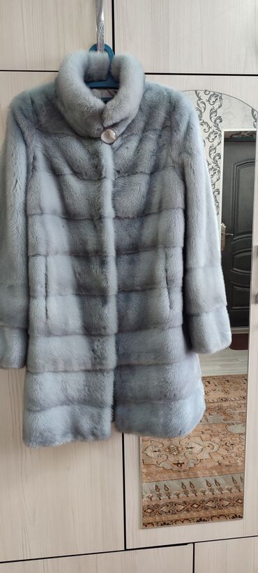 Шуба из норки, цвет дымчато‑серый (light grey). Прямой силуэт до колена, горизонтальная раскладка шкур. Высокий стойка‑воротник на крупной декоративной пуговице, скрытая центральная застёжка на крючках. Рукав 7/8 с широкими отворотами. Два боковых прорезных кармана. Подкладка гладкая атласная в тон. Внутри предусмотрен потайной карман на молнии. Мех мягкий, густой, с благородным переливом. Универсальная длина и лаконичный крой подчёркивают элегантность и подходят как для повседневных, так и для нарядных образов. Размер ориентировочно M–L (см. посадку на плечах на фото). Цвет красиво играет на свету от серебристого до голубовато‑серого.