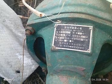 - Центробежный насос (зелёный корпус) с табличкой на китайском, установлен на единой станине, привод от двигателя клиновыми ремнями.
