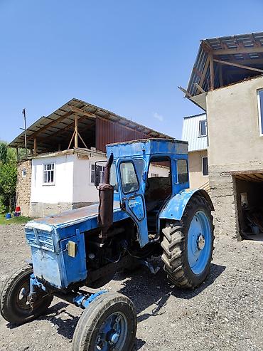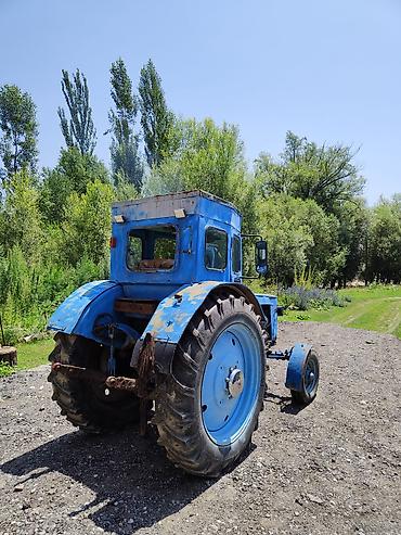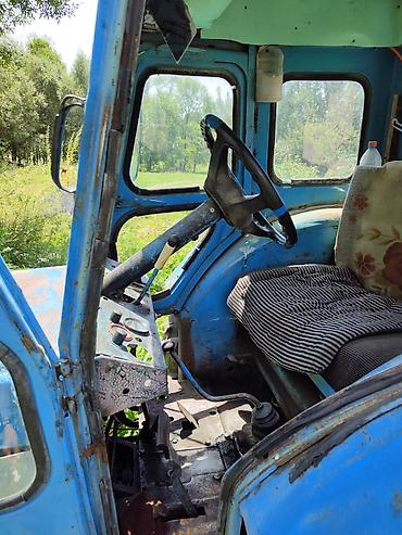 Трактор колесный с кабиной, с передними одинарными и задними широкими сельхозшинами. Окраска синяя. Кабина остекленная, с дверями, вентиляционным люком и рабочими плафонами/габаритами сзади. Управление механическое: рычаг КПП напольный, педали сцепления и тормоза, ручной газ, рычаги гидравлики. Приборная панель с базовыми индикаторами, рулевое колесо трехспицевое.