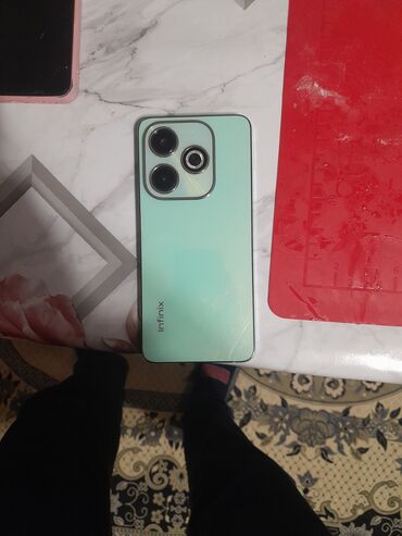 - Современный дизайн: плоские грани, матовая задняя крышка бирюзово‑зелёного оттенка, логотип Infinix.