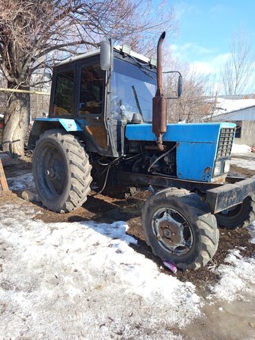 МТЗ 82 Трактор колесный СРОЧНО, кабина с остеклением по периметру, рабочее освещение на крыше (два светодиодных прожектора), зеркала заднего вида, высокий вертикальный выхлоп. Передний брус/рамка под навесное и противовесы, задняя трехточечная навеска (видна сцепка), гидросистема для подключения орудий. Широкие задние сельскохозяйственные шины, передние узкие для междурядной работы. Подходит для пахоты, культивации, посева, перевозки прицепов и коммунальных задач. Удобная закрытая кабина для работы в холодное время года. Цвет синий/черный.
