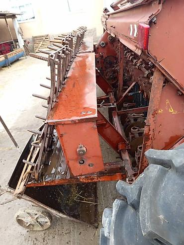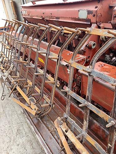 В комплекте навесная сеялка/жатка (рядковый аппарат с пальцевыми направляющими и колесом‑копиром) — механизм подачи семян/массы, цепные приводы, регулируемые направляющие планки и бункер.
