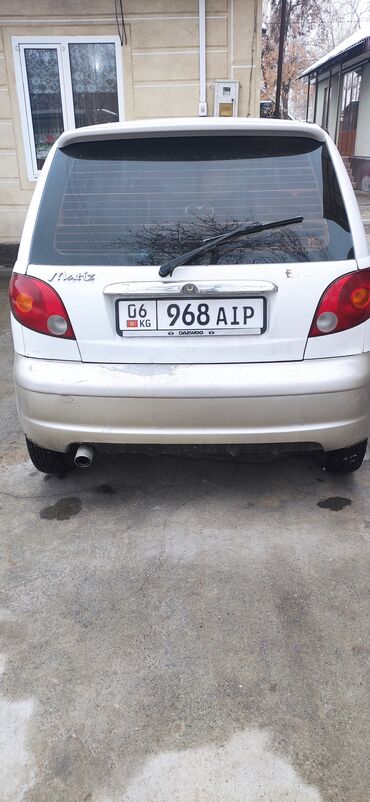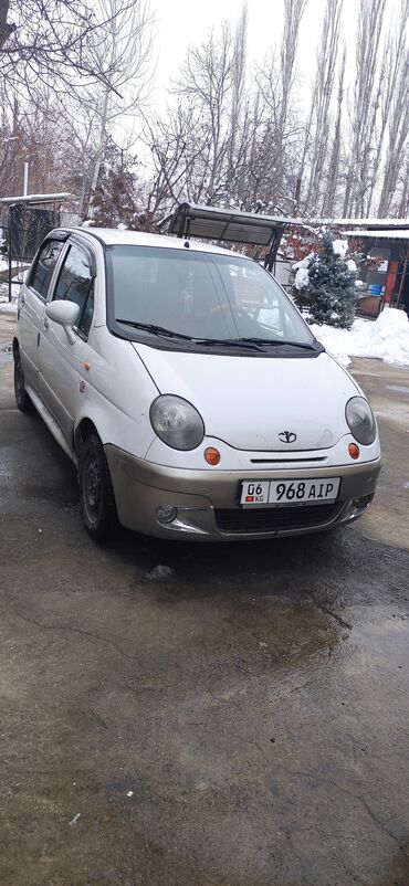 Daewoo Matiz, 5‑дверный хэтчбек, правый руль отсутствует (левый). Цвет белый с серебристым низом. Номерные знаки KG. Компактный городской автомобиль с экономичным бензиновым мотором, передний привод.