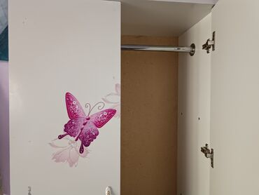 - Материал: ЛДСП, белый цвет. - Декор: яркие наклейки с бабочками, звездами и радугой на фасадах. - Конструкция: 3 створки + нижние выдвижные ящики. - Левый/центральный отсек: отделение с штангой...