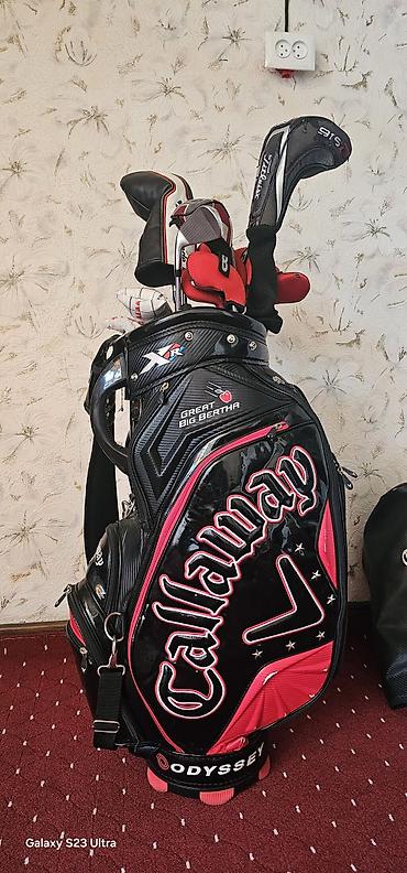 - Профессиональная туровая сумка Callaway XR Great Big Bertha (глянцевое черно‑красное исполнение), широкий ремень для переноски, множество карманов на молниях, кольца для аксессуаров, отделение для напитков. На основании – бренд Odyssey. В комплекте съемный дождевик/кожух Callaway.