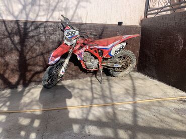 Кроссовый мотоцикл (питбайк/эндуро-стиль), красно-белый с синими акцентами и стартовыми номерами 58.