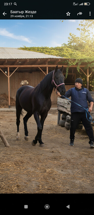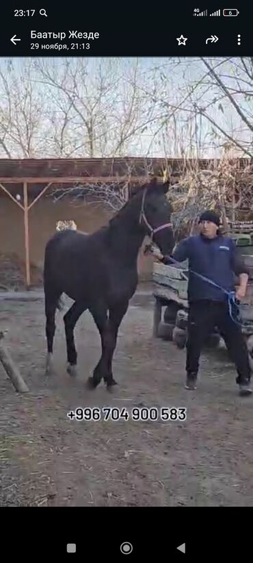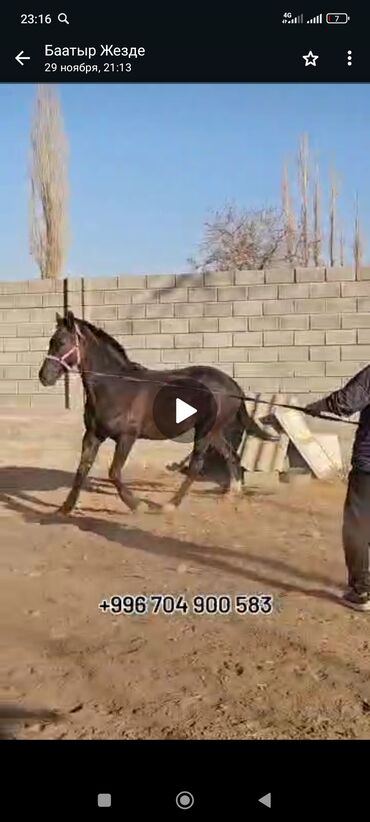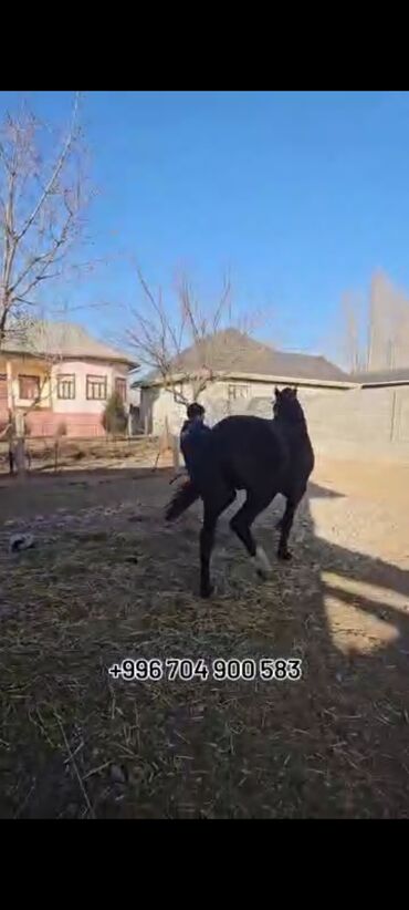 Продаётся лошадь темной масти (вороная/темно-гнедая). Крупная, высокая, с выраженной мускулатурой и крепкими ногами. На фото и видео — работа на корде: активный шаг и резвая рысь, ровный ход, хороший вынос переда. Голова пропорциональная, уши поставлены правильно, шея длинная, корпус плотный. Хвост и грива ухожены, копыта аккуратные.