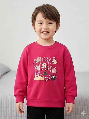 Детский свитшот «HAPPY BEAR» (Istanbul Original) - Цвет: розово‑лиловый с белыми и чёрными элементами - Принт: крупный забавный медвежонок‑кролик с розовыми щёчками, мелкие персонажи по всему пере...