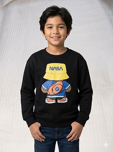- Модели: несколько вариантов с яркими рисунками — милые зверята и надписи, «Favorite Apps», новогодний мотив на груди, а также черный свитшот с крупным принтом NASA.