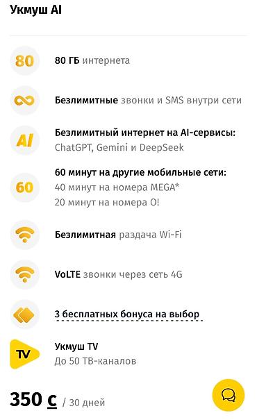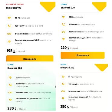 Новый выгодный тариф для мобильной связи - 50 ГБ интернета + 10 ГБ бонус до марта - 150 минут на другие сети - Абонплата: всего 300 сом в месяц Отлично подходит для активного серфинга, соцсетей, ...