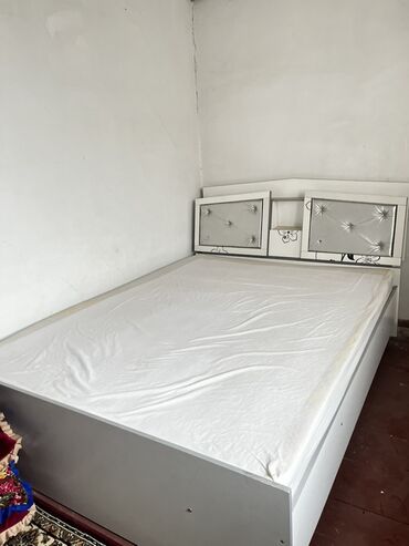 - Кровать двуспальная с высоким мягким изголовьем. Каркас массивный, корпус светлый; изголовье с декоративными вставками и стяжками. Основание сплошное.