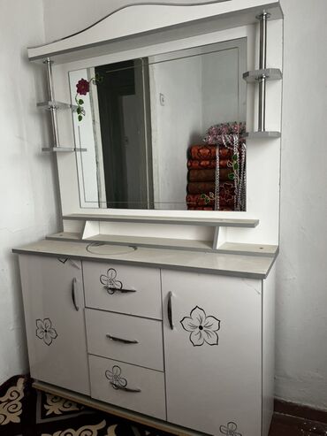 - Туалетный стол с большим зеркалом. Верхняя панель с двумя открытыми полочками по бокам, тумбы с распашными дверцами и три выдвижных ящика по центру. Фасады глянцевые с цветочным рисунком, металлические ручки.