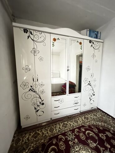 - Шкаф-купе/распашной большой модульный: пять дверей, центральная секция с двумя зеркалами, внизу три выдвижных ящика. Фасады белые с черным цветочным орнаментом и зеркальными вставками.