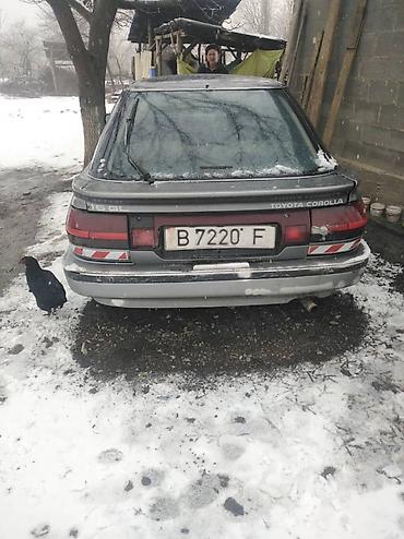 Toyota Corolla, кузов E90 (примерно конец 80‑х – начало 90‑х), седан/лифтбек 4 двери. Серый цвет. Заводские шильдики Toyota Corolla, номера В7220 F на бамперах.