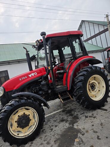 Трактор YTO X704, колёсный, красный. Основные характеристики: - Полноразмерная кабина с остеклением по периметру, передние и задние рабочие фары на крыше. - Дизельный двигатель с вертикальным выхл...