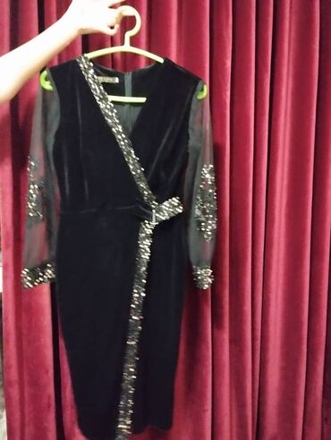 1) Черное коктейльное платье миди с V‑образным вырезом и акцентной драпировкой на талии. Материал — бархат. Полупрозрачные рукава 3/4 из сетки с вышивкой бусинами/пайетками. По диагонали и на манжетах — расшитые блестящие декоративные полосы. Застежка на молнию сзади.