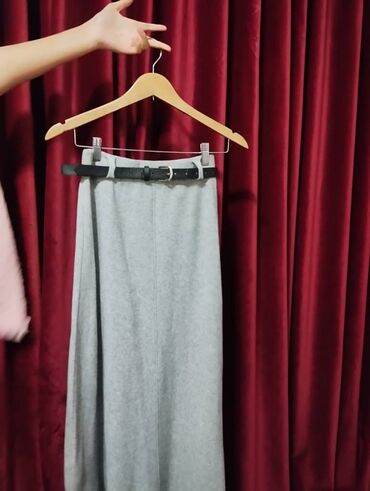3) Серая юбка миди прямого кроя с поясом. Поясной ремень черного цвета с пряжкой входит в комплект. Ткань мягкая, плотная, держит форму.