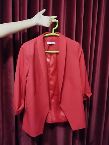4) Красный женский пиджак/жакет без застежки, с подкладкой. Рукава 3/4 с легкой сборкой, мягкие лацканы, приталенный силуэт.