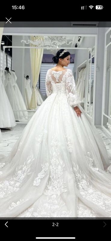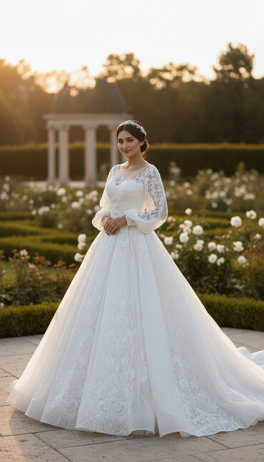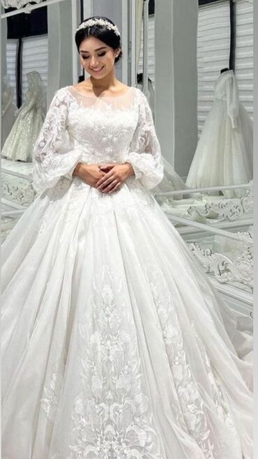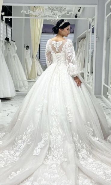 Свадебное платье в классическом стиле «принцесса» с длинным пышным шлейфом.