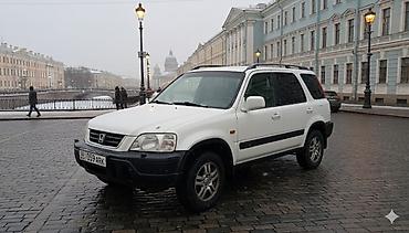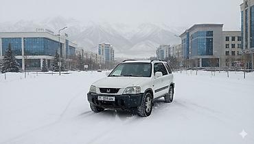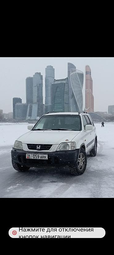 Honda CR‑V, 1‑е поколение (рестайлинг). зимний шины новый Кузов белый, пятидверный кроссовер. Легкосплавные диски, рейлинги на крыше, тонированные задние стекла, боковые молдинги. Передние противотуманные секции в бампере, зеркала и ручки в цвет кузова. Дорожный просвет увеличенный, подходящий для плохих дорог.
