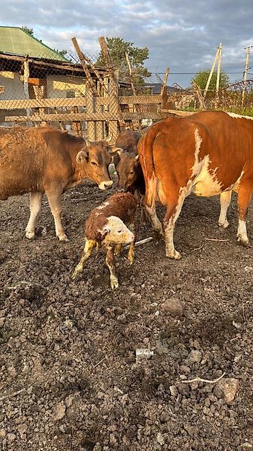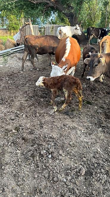 Корова с телёнком. - Отёл: 8 апреля (второй отёл). - Масть коровы — чёрная; телёнка — рыже-белая. - Рога короткие, бирки в ушах. - На фото — корова с новорождённым телёнком на подворье. Под...