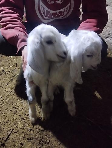 Козлята (белые, ушастого типа). На фото — молодые козлята рядом с маткой, крепкие, активные, на подсосе. Окрас преимущественно белый, ровная шерсть, длинные висячие уши, правильная постановка ног. Подходят для дальнейшего выращивания на племя или откорм, неприхотливы в содержании. Возможна разнополая пара (по фото — двое козлят одного помёта). Отлично адаптируются к хозяйственному содержанию, быстро набирают вес, активно пьют молоко.