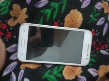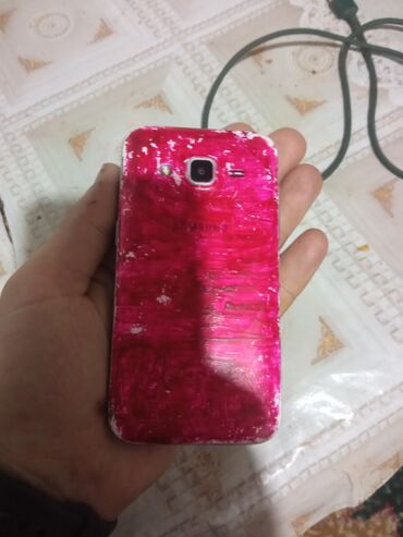 Смартфон Samsung Galaxy J1 (серия J1 Mini/J1 2016 — компактная модель с кнопкой «Домой»). Белая фронтальная панель, задняя крышка окрашена в розово-красный цвет. Экран около 4 дюймов, есть механическая клавиша «Домой» и сенсорные кнопки «Назад» и «Меню». На задней стороне — основная камера с вспышкой и динамик. Слот для microUSB снизу, боковые клавиши питания и громкости. В комплекте — кабель USB–microUSB (на фото зеленого цвета).