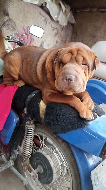 - Порода: шарпей (характерные складки кожи, компактное мускулистое телосложение, короткая плотная шерсть).