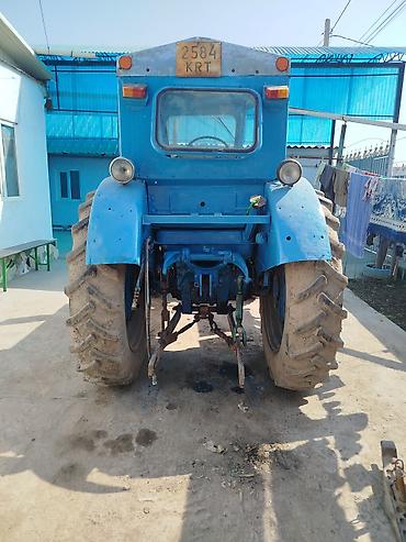 Трактор колесный, класс 1,4–2,0 тс, окраска синим цветом. Кабина закрытая с остеклением по периметру, боковые двери, ветровое стекло с форточкой. Передние фары и задние габариты/стоп-сигналы установлены. Высокий выхлопной патрубок.