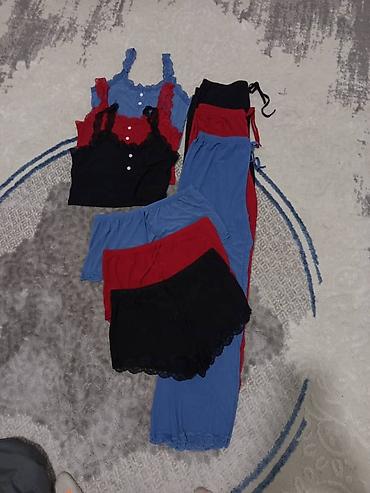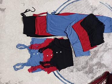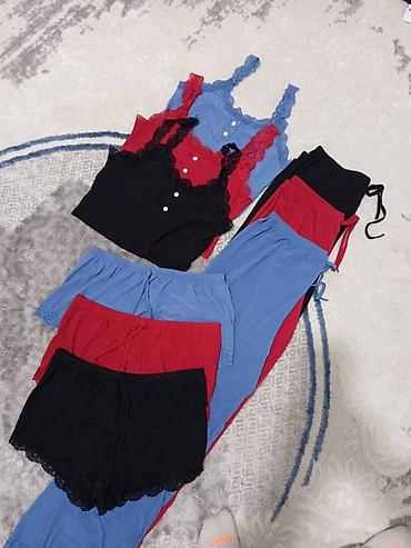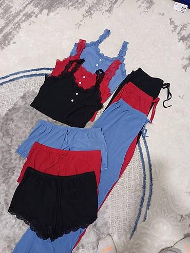 - Низ на выбор: шорты с кружевной кромкой по низу или длинные брюки на мягкой резинке и завязках. Цвета в тон топам: черный, красный, голубой.