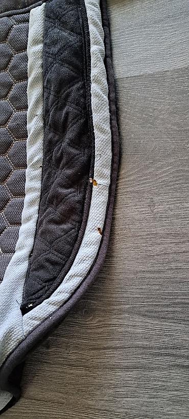 На фото показана лицевая и изнаночная стороны и элементы крепежа; на одном из краёв видны небольшие проколы/прорывы ткани окантовки.
