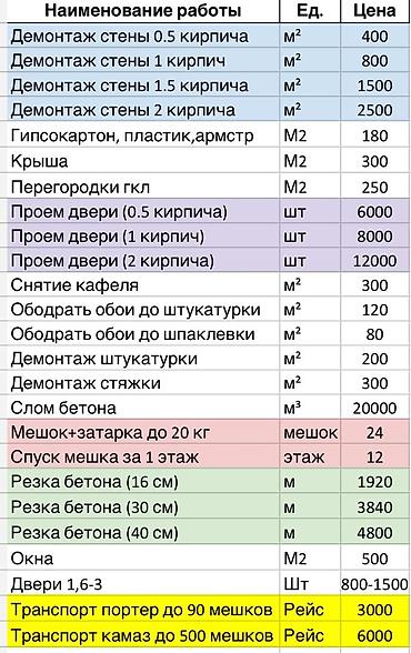 Демонтажные работы под ключ - Снос перегородок из кирпича, пеноблока, гипса, бетона - Разборка старой отделки: штукатурки, плитки, стяжки, потолков, сантехкабин - Выбивка проёмов, расширение двере...