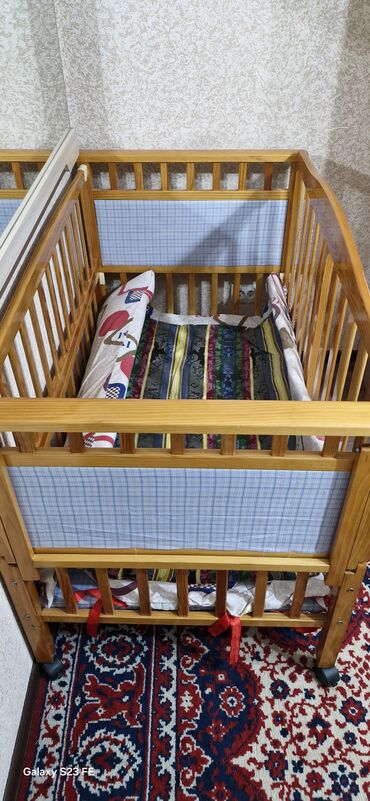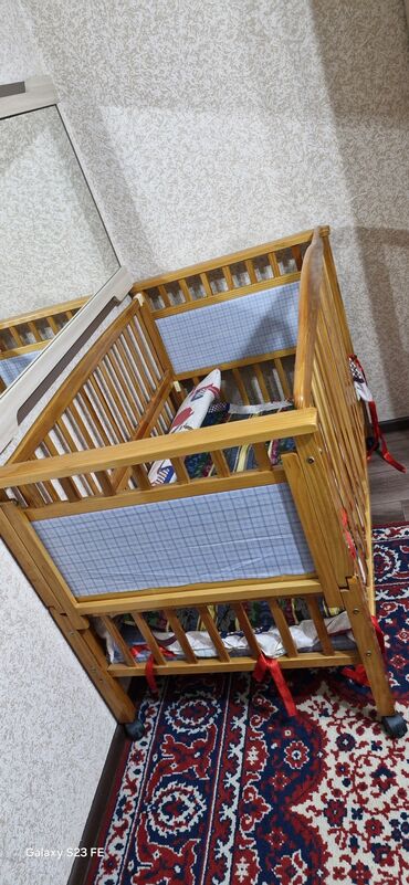 Деревянная детская кроватка светлого оттенка, оснащенная колесиками для удобства перемещения. Кроватка имеет решетчатые бортики, обеспечивающие вентиляцию и безопасность, а также закругленные углы. В конструкции предусмотрены элементы, позволяющие трансформировать кроватку по мере роста ребенка. Модель подходит для использования в детских комнатах, обеспечивая комфортное и безопасное спальное место. Б/У