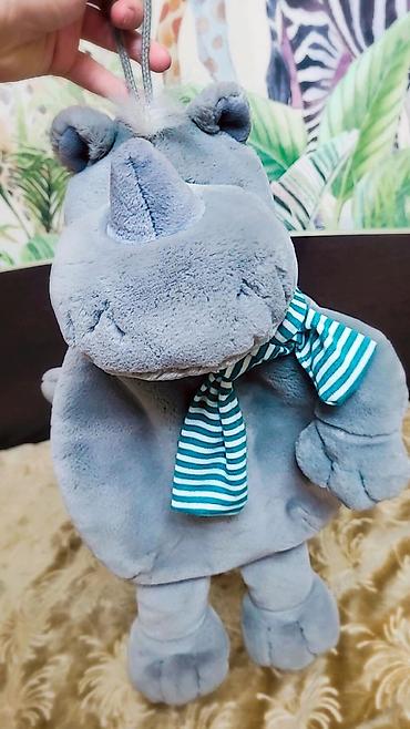 - Носорог серый игрушка рюкзак, с большим мягким рогом и полосатым шарфом, объемные лапки, уютный плюш.