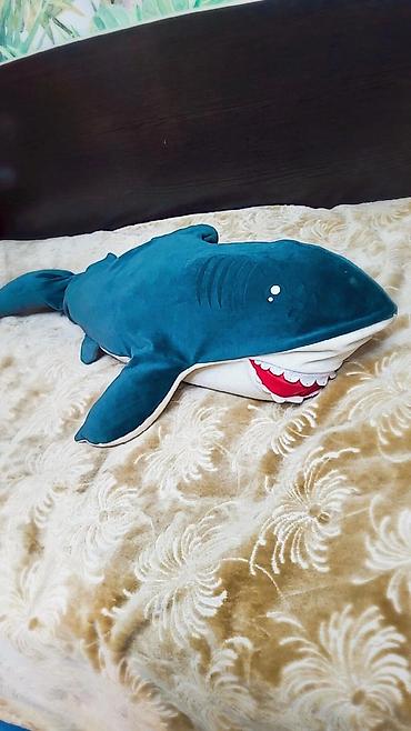 - Большая плюшевая акула-подушка синего цвета с белым брюхом и забавной улыбкой. Подходит для обнимашек и как декоративная подушка на кровать/диван.