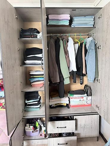 - Внутри: справа — отделение с штангой для вешалок и верхней полкой; слева — четыре вместительные полки; внизу — широкая полка и два выдвижных ящика.
