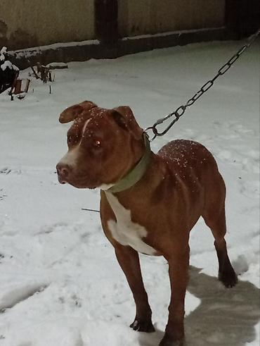 Собака крупной породы, рыже-каштановый окрас с белыми отметинами на груди, грудино-брюшной линии и на лапах. Корпус мускулистый, мощная шея, широкая грудь, крепкие конечности. Уши полустоячие/полуприподнятые. На фото — на прочном металлическом поводке-цепи и широком зелёном ошейнике из плотной кожи с металлической фурнитурой.